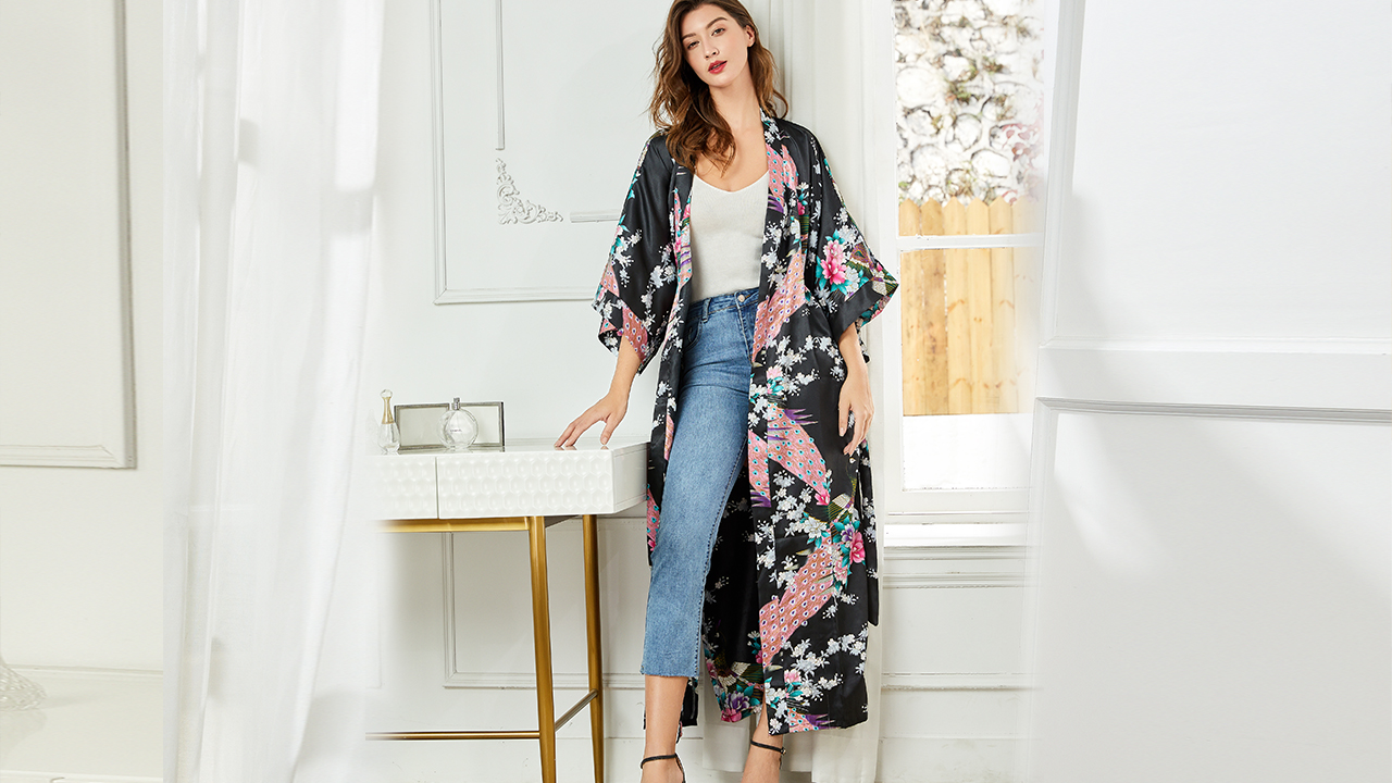 Continuous printed sleeves, luxury printed peacock and floral kimono dress.