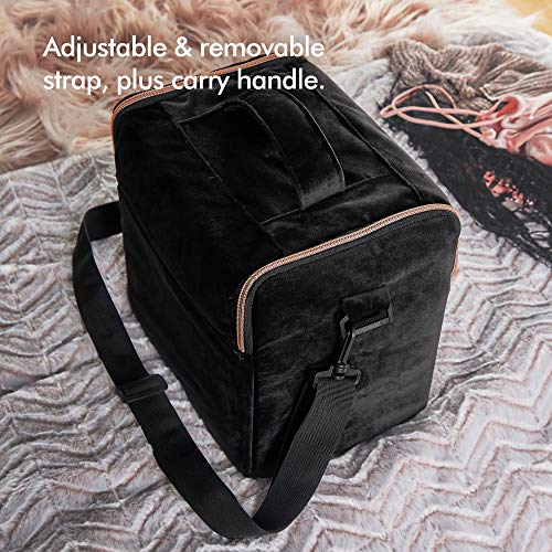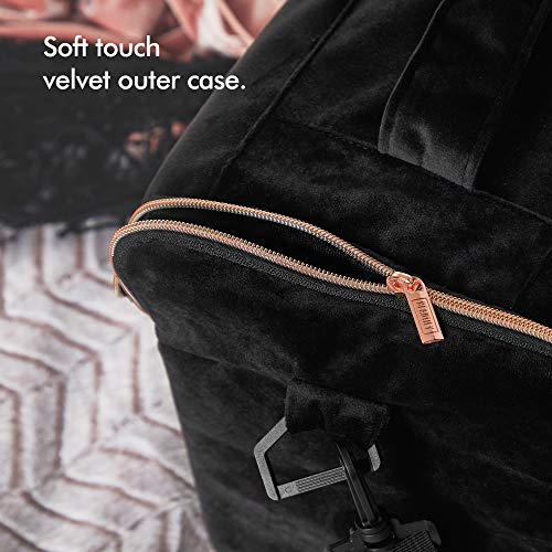 BLACK VELVET & ROSE GOLD – look good on-the-go with a stylish carry case finished in a soft touch black velvet with a remark rose gold zip
