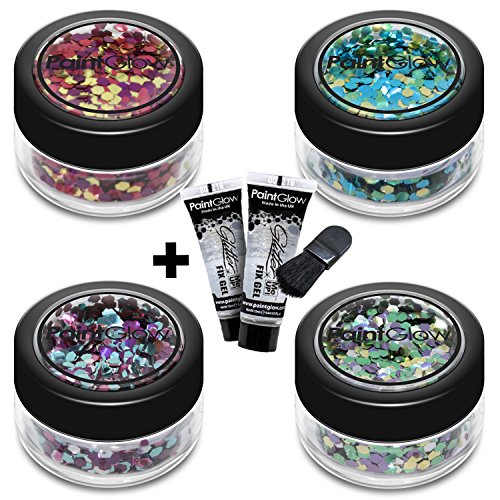 Product Description PaintGlow NEW Biodegradable GLITTER is a mix of loose Chunky cosmetic grade glitters. Over 2 unique ranges these include Bio-blends which is a mixture of different colour blends in Chunky and smaller, we call these MULTI-MIXES these are exclusive colours that you’ll’t buy elsewhere. Bio-shade colours are Chunky solid colours. Come in a 3g pot all manufactured in the United Kingdom. A little pot goes a long way, stand out from the crowd without affecting the environment. Our Bio or Eco-glitter is made from biodegradable plant cellulose film from sustainably farmed trees (mainly Eucalyptus). The plant cellulose is dyed with cosmetic grade dyes. It is then covered in the tiniest amount of metal to give it it’s shine which makes it 30 to 40% softer than polyester glitter. It complies with EU and FDA cosmetic regulations and EU Toy regulations. Caution: Please be extra careful if applying glitter near the eyes and mouth. If the use of bio glitter with solvents all the time test first (because it is plant based it won’t work with some nail applications) PaintGlow glitter is sold in Superdrug, Asos and Home bargain stores in the United Kingdom. So whether you’re going on a night out, or to a festival, be prepared to shimmer the night away! To apply the glitter, simply use the included 2x glitter fix glue to attach glitter in place which lasts for hours. Simply wash off with soap and water Pack includes 7 items in total: 4x Bio Glitter Colours: Sea Urchin, Ice Queen, Rain Forest, Rainbow Fish 2x Fix glue gels 1x Brush applicator
