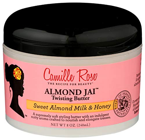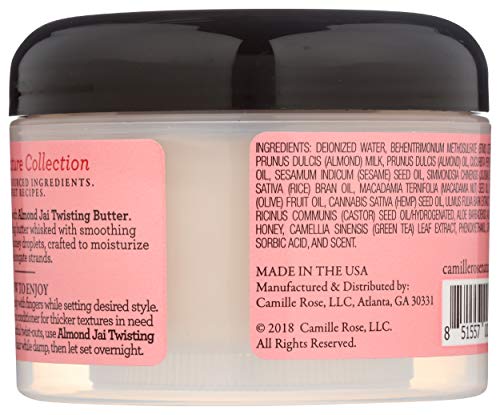 Camille Rose Naturals almond Jai twisting butter 240ml best twisting butter ever! Achieve the ultimate soft fully twist out with a combination of almond milk, almond oil, Jojoba, hemp and a drizzle of honey. Your style will be elongated, silky and held in place! Great on dry hair but can be used while hair is wet. Make sure every strand is moisturized with our butter blend for maximum results. Use entire line of Camille Rose Naturals products and enjoy! Oil cocktails of pumpkin, macadamia and olive are churned into our nutrient-rich almond milk base, then drizzled with touches of organic honey for intense moisturizing benefits. We finish with a botanical juice blend of Aloe and green tea extract to create this softening hair butter for curly, wavy and coiled textures. Our botanical blend of oils and butters will aid in managing course/thick hair, leaving a soft and smoother feel. Softens and moisturizes hair while nourishing the scalp and stimulating growth.