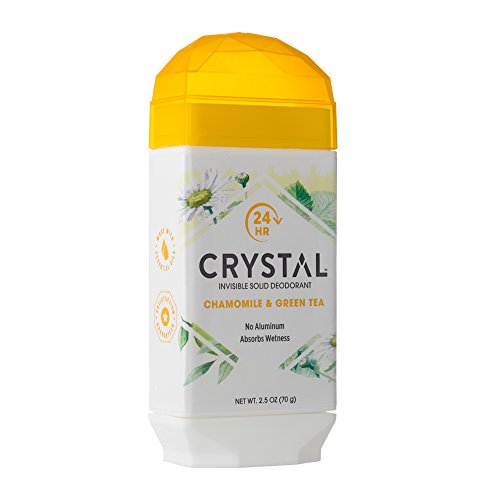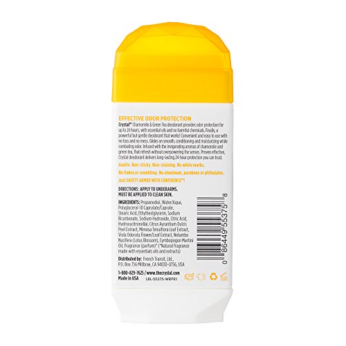 CRYSTAL Chamomile & Green Tea Invisible Solid Deodorant removes odor whilst absorbing excess moisture with a touch of baking soda. The unique domed shape glides on silky smooth, conditioning the skin with nurturing ingredients like Mimosa Leaf and Sweet Violet Extract. Odor-neutralizing crucial oils, including Lotus Blossom and Orange Peel Extract, delivers long-lasting 24-Hour protection.
