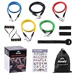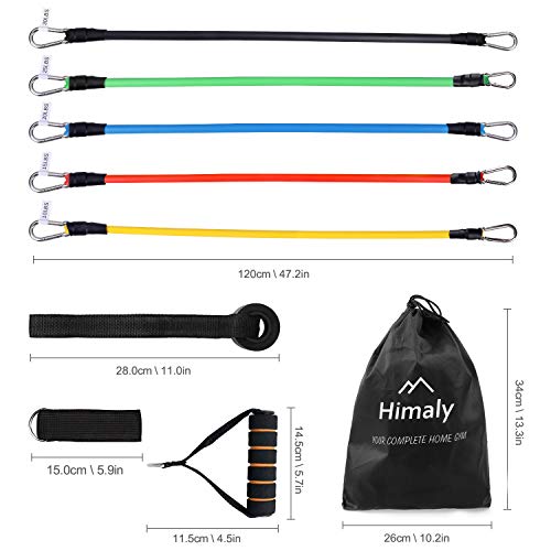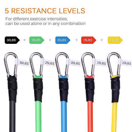 12pcs in one set: 5pcs different resistance bands[ Black(30lbs) > Blue(25lbs) > Red(20lbs) > Green(15lbs) > Yellow(10lbs)], 2pcs anti-slip handles, 1pcs premium door anchor, 1pcs workout guide and 1pcs carry gift bag, you’ll have multi functional set, easy to train, easy to carry for travelling
