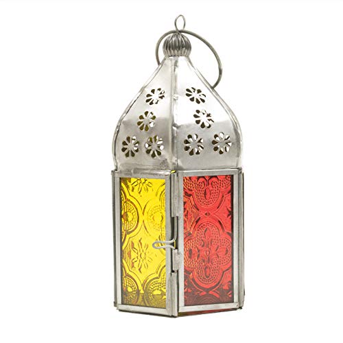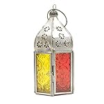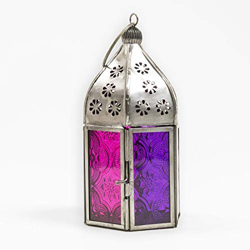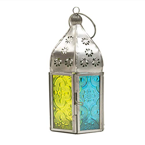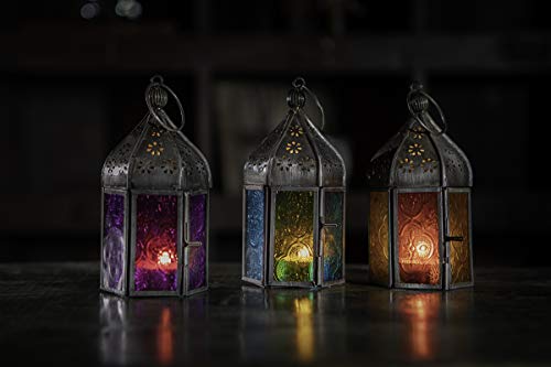 Moroccan Style Tonal Mini Glass Tea Light Lanterns constituted of iron with coloured glass panes in Indian on a fair trade basis. They may be able to be hung or placed on a table inside or out of doors. Holds one tealight. Implausible mood lighting for home or garden. Size: W 7 cm x D 7 cm x H 15 cm Care: Wipe clean with a damp cloth. Place on a heatproof surface. Don’t leave burning candles unattended. Caution: would possibly turn into hot all over and after use.