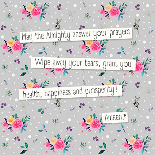 A heartfelt du’a card from our “A Million Du’as” selection of sentimant cards. This fantastically illustrated card offers the recipient a heartfelt du’a for health, happiness and brings with it reminders of hope and patience. Blank Within on your own personal message and printed on premium quality FSC approved board. Dimensions: This Muslim card measures 15 x 15 cm. It is provided with a white envelope and packaged in a transparent sleeve.