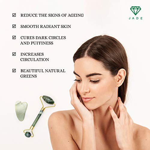 ✅ ANTI-AGEING: This Jade Roller and Gua Sha Scraper set is will bolster your weekly beauty regime and reduce the visible signs of ageing. Regular use stimulates blood flow, triggers lymphatic drainage and encourages natural toxin removal from the facial area..
