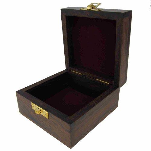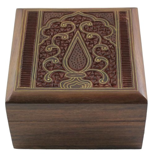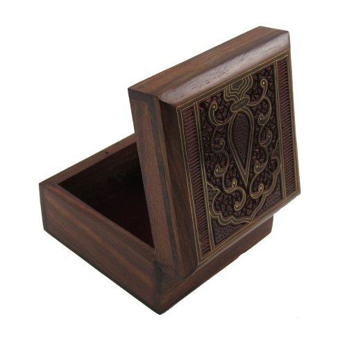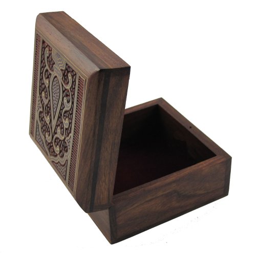 Measuring 4 inches in length by 4 inches in width by 2.25 inch in height, the Indian Jewelry Holder is the perfect small wood box for displaying anywhere from the dresser to the nightstand to the vanity. Square designs like this one are especially handy for use as jewelry boxes for necklaces, as they allow you to lay the chains out flat in order to prevent knotting and tangling.