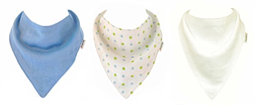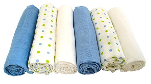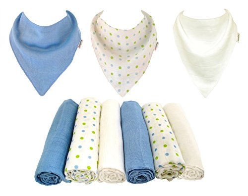 Muslinz baby muslin squares. Size 70 x 70 cms. A mixed 6 pack combination containing 2 blue, 2 White and 2 matching spots design. Matching 3 pack cotton muslin dribble bibs. Created from 2 layers of cotton muslin. 2 popper adjustment on the back and suitable for As much as approx 12 months. 100% cotton. Machine washable. Great as a newborn nappy, swaddle, burp cloth,comforter, breast feeding shield and general mopping up cloth. A should have for each and every new parent ! Muslinz make a really perfect New Baby Gift. Muslinz muslin squares are very good quality. They’re made with a tighter weave in order that they hold their shape and wash well. The more you use then the softer they get ! Muslinz is a registered Trade mark. Other colours and combinations are to be had.