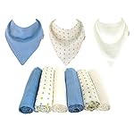 Muslinz baby muslin squares. Size 70 x 70 cms. A mixed 6 pack combination containing 2 blue, 2 White and 2 matching spots design. Matching 3 pack cotton muslin dribble bibs. Created from 2 layers of cotton muslin. 2 popper adjustment on the back and suitable for As much as approx 12 months. 100% cotton. Machine washable. Great as a newborn nappy, swaddle, burp cloth,comforter, breast feeding shield and general mopping up cloth. A should have for each and every new parent ! Muslinz make a really perfect New Baby Gift. Muslinz muslin squares are very good quality. They’re made with a tighter weave in order that they hold their shape and wash well. The more you use then the softer they get ! Muslinz is a registered Trade mark. Other colours and combinations are to be had.