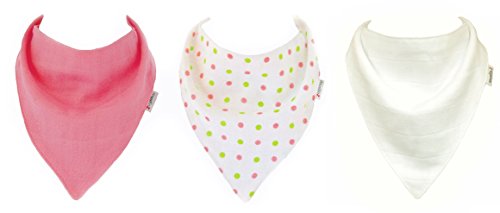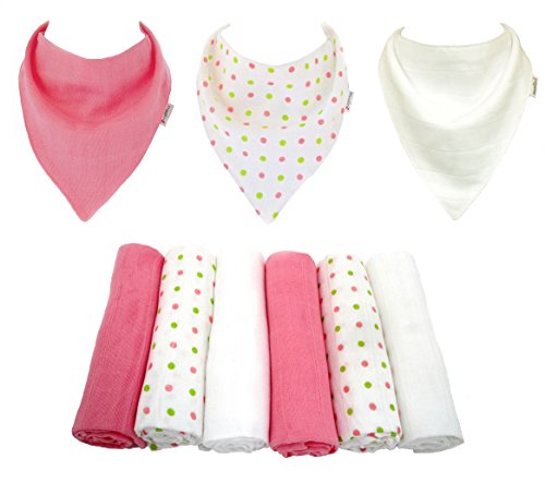 Muslinz baby muslin squares. Size 70 x 70 cms. A mixed 6 pack combination containing 2 pink, 2 White and 2 matching spots design. Matching 3 pack cotton muslin dribble bibs. Made out of 2 layers of cotton muslin. 2 popper adjustment on the back and suitable for As much as approx 12 months. 100% cotton. Machine washable. Great as a newborn nappy, swaddle, burp cloth,comforter, breast feeding shield and general mopping up cloth. A should have for each new parent ! Muslinz make a really perfect New Baby Gift. Muslinz muslin squares are superb quality. They’re made with a tighter weave so they hold their shape and wash well. The more you use then the softer they get ! Muslinz is a registered Trade mark. Other colours and combinations are to be had.