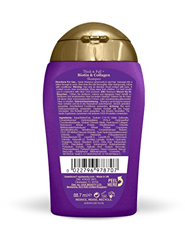 Aqua/Water/Eau, Sodium C14-16 Olefin Sulfonate, Cocamidopropyl Hydroxysultaine, PPG-2 Hydroxyethyl Coco/Isostearamide, Sodium Chloride, Biotin, Hydrolyzed Collagen, Hydrolyzed Wheat Protein, Ethyltrimonium Chloride Methacrylate/Hydrolyzed Wheat Protein Copolymer, Amodimethicone, Dimethicone, Cocamidopropyl Betaine, PEG-120 Methyl Glucose Dioleate, Guar Hydroxypropyltrimonium Chloride, Glycol Distearate, Polyquaternium-6, Polyquaternium-10, Laureth-4, Laureth-23, Cetrimonium Chloride, Trideceth-12, Sorbitan Laurate, Sodium Hydroxide, Propylene Glycol, Disodium EDTA, Citric Acid, Tetrasodium EDTA, Diazolidinyl Urea, Iodopropynyl Butylcarbamate, Parfum/Perfume, Hexyl Cinnamal, Benzyl Benzoate, CI 60730/Ext. Violet 2, CI 16035/Red 40, CI 19140/Yellow 5