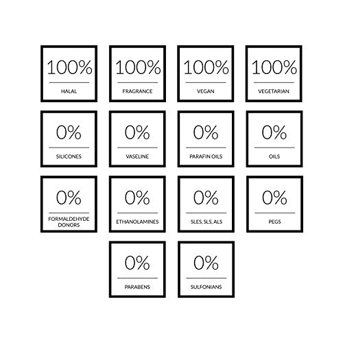 “SAFE FORMULA” -HALAL product: for Vegans, for Vegetarians, no parabens, no sulfonates, no alcohol, no animal derivatives, no PEG-S, no SLES, no SLS, no ALS, no silicones, no Vaseline, no paraffin oils, no oils, no formaldehyde donors, no ethanolamines, fragrance free
