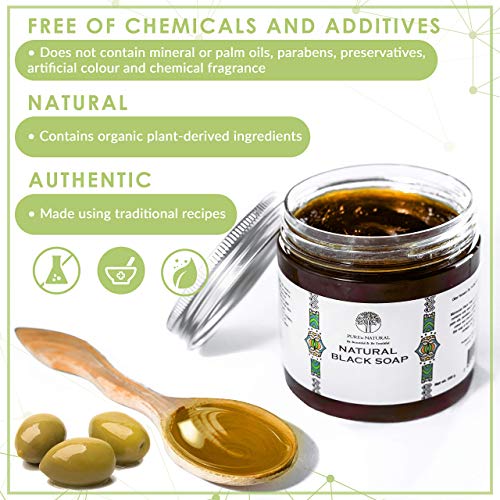 π NATURAL AND ORGANIC – Our black soap is made from traditional recipes and only contains organic ingredients without mineral or palm oils parabens synthetic preservatives artificial colour and chemical fragrance. Made from virgin black olive oil pureed with black olives this soap is extremely rich in vitamin E. It helps to revitalise the skin acting against dryness dehydration and ageing skin.