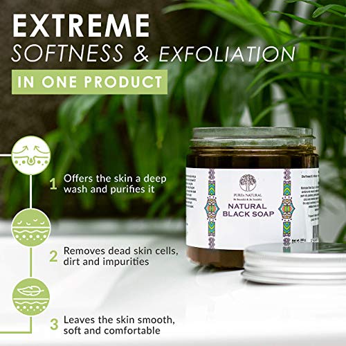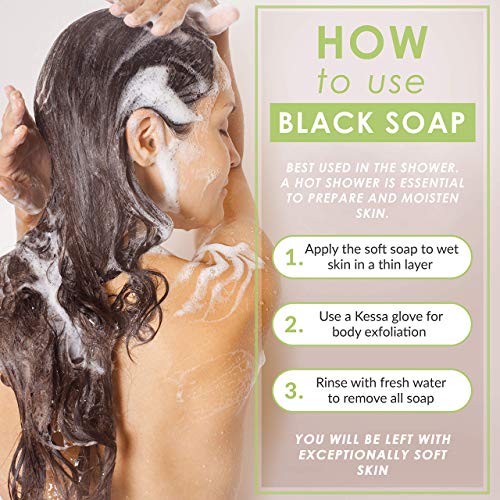 βοΈ HOW TO USE BLACK SOAP – Best used in the shower. Apply the soft soap to wet skin. For body exfoliation use a Kessa Exfoliating Gloves. As you are cleansing rinse with fresh water to remove all soap. You will be left with exceptionally soft skin.