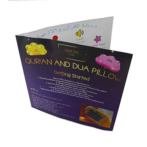 DESCRIPTION Our Cute Soft Cuddly Quran Pillow Is A Great Introduction To Islam For Your Child. IN STOCK 20th June 2018 InshaAllah 😊 THE QURAN And DUA PILLOW With Lighting And Sounds 😊 Incorporates: Quran Surahs Surah Fatiha Ayatul Kursi Amanar Rasuloo (End Of Surah Baqarah) Surah Yaseen Surah Ar Rahman Surah Mulk 3 Quls Arabic Duas: Sleeping Waking Before Doing Anything else (Bismillah) For Praising Allah (Alhamdulillah) For Learning More Wisdom For When We Sneeze Before Eating After Eating When Going To The Toilet After Leaving The Toilet When Going Out Of The House When Greeting Someone (Assalamualaykum) When Replying To A Greeting (Walaikumsalaam) Asking For forgiveness Nasheeds Assubhu Badaa – Allahu Allahu 99 Names of Allah – Asma Ul Husna – Kamal Uddin Los angeles Ilaha Illah – Kamal Uddin Alif Baa Taa -Arabic alphabet 4 Durood Sharif’s 7 Kalima’s 1 First Kalima (Tayyab): 2- Second Kalima (Shahadat): 3- Third Kalima (Tamjeed): 4- Fourth Kalima (Touheed): 5- Fifth Kalima (Astaghfar): 6- Sixth Kalima (Radd-e-Kufar): 7 Seventh Kalima (Imane Mufasal) English Duas Make Me A Hafiz Of The Quran Assist Me To Give Charity Make Me A Just right Muslim Take Me And My Circle of relatives To Jannah Take Me To Makkah & Madina Assist Me To Be Just right To My Parents Bless My Parents With Jannah Forgive My Parents, Grandparents And All Muslims 60 MINUTES OF RECITATION