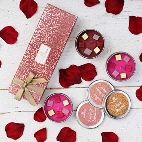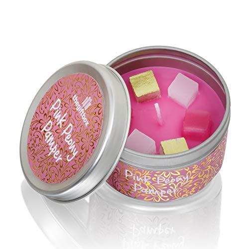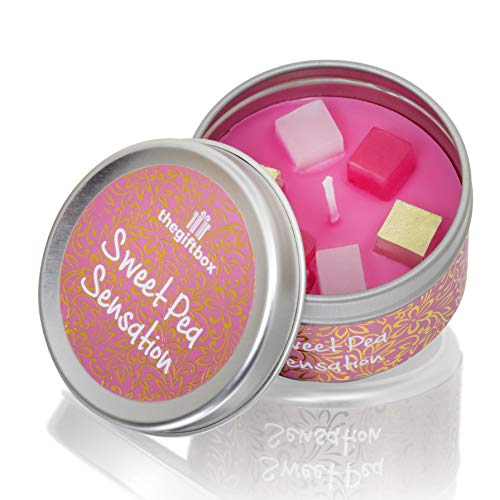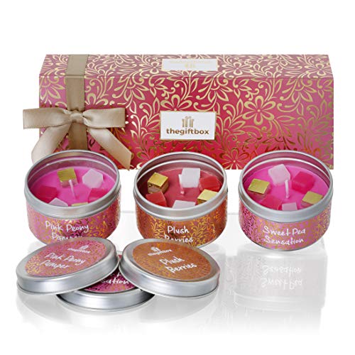 THIS SCENTED CANDLE TIN SET INCLUDES THE FOLLOWING SCENTS; PINK PEONY, PLUSH BERRIES AND SWEET PEA and will burn off a welcoming aroma blending the fresh, gentle and sweet scent of flowers with notes of wealthy sweet pea