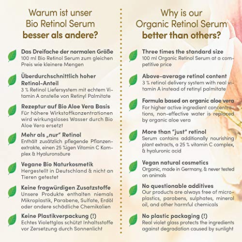 ✅ VEGAN ORGANIC NATURAL COSMETICS / SKIN CARE MADE IN GERMANY – Dermatological tests confirm that our serum is gentle to your skin. It is formulated WITHOUT parabens, sulphates, microplastics, & animal cruelty. Made in Germany. Clinical studies prove the effectiveness of its ingredients. Our 3x larger violet glass bottles with air-tight pump make sure you’ll receive the best value for money. In open containers (e.g. pipettes), vitamins may lose their effectiveness due to oxidation.